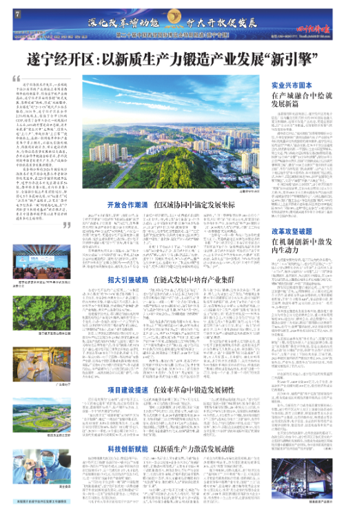 2025年5月23日《四川经济日报》07版 遂宁经开区: 以新质生产力锻造产业发展“新引擎” 遂宁经济技术开发区,一座崛起于涪江右岸的产业新城正书写着西部开放的新篇章。作为遂宁的产业新高地,遂宁经开区始终坚持“链式发展、集群突破”战略,形成“双核驱动、多点爆发”的“2+1+N”现代产业体系格局。2024年,遂宁经开区在全市2.5%的地域上,创造了全市13%的GDP,培育了全市三分之一的规模以上工业,60%的外贸进出口总额。这片承载着“实业兴市‘主阵地’、引客入遂‘主门户’、市域经济‘主引擎’”使命的热土,在新一轮科技革命和产业变革中勇立潮头,以招大引强的魄力、科技创新的活力、项目建设的热力,勾勒出高质量发展的壮美画卷,在开放合作中链接全球资源,在科技创新中培育新质生产力,在产城融合中绘就高质量发展新图景。 鸟瞰遂宁经开区 商务部公布的2024年国家级经济技术开发区综合发展水平考核评价结果显示,在229家国家级经开区中,遂宁经济技术开发区排名第54位,西部排名第8位,省内排名第3位。全国排位较上年度前进92位,取得近5年来最好成绩。从“切薯片”到“造芯片”的产业蝶变,这里是“西部电子信息第一城”的崛起之地,是“中国轻型飞机制造基地”的启航之港,更是中国西部经开区以改革创新拥抱未来的生动缩影。 开放合作潮涌 在区域协同中锚定发展坐标 2025年4月的深圳,春潮与商机共涌。遂宁经开区带着“中国轻型飞机制造基地”的蓝图与“西部电子信息第一城”的底气,在粤港澳大湾区重点产业合作推介会上惊艳亮相。这场跨越1500公里的“双向奔赴”,不仅是一次项目的签约,更是遂宁经开区深度融入国家战略、链接全球资源的生动注脚。遂宁经开区熠熠生辉的9张“国字号”名片,吸引着全球投资者的目光。 遂宁经济技术开发区2025年深圳招商引资推介会 在粤港澳大湾区企业家眼中,遂宁经开区地处成渝“1小时经济圈”核心节点,以128公里半径覆盖成都、重庆两大国家中心城市,坐拥“公铁水空”立体交通网络——成达万高铁、绵遂内铁路加快建设,南坝机场正升级为川渝低空经济枢纽,规划中的西部首条城际无人机货运走廊,将实现“遂宁制造”2小时通达成渝、12小时辐射东南亚。这种立体开放格局,让遂宁经开区从内陆腹地变身“一带一路”与长江经济带的重要链接点,这种“左右逢源”的区位优势,使其成为成渝地区双城经济圈中承接产业转移、辐射西部市场的“战略支点”。 秉承“上下楼就是上下游、产业园就是产业链”的全新生态理念,遂宁经开区创新“飞地经济”模式,深圳研发团队完成芯片设计,遂宁工厂实现封装测试,2024年该产业链产值突破45亿元,全球每10部手机就有1颗“遂宁芯”。更令人瞩目的是低空经济领域的跨区域协作,与万丰奥特集团共建5000亩航空产业园,引进浙江的飞机制造技术,配套四川的钛合金材料产业,目标形成“年产200架轻型飞机、5000架无人机”的产能,打造“长三角技术+西部制造”的协同典范。 “这里是‘一带一路’和长江经济带的重要交汇点,更是成渝地区双城经济圈建设的‘棋眼’。”遂宁经开区党工委书记彭普诚道出了园区的区位自信。随着西部陆海新通道建设提速,遂宁经开区依托“蓉欧班列”遂宁基地、公用型保税仓等开放平台,构建起“东联西出、南接北达”的开放格局,2024年外贸进出口总额占全市60%,成为四川对外开放的“西向门户”。 招大引强破局 在链式发展中培育产业集群 在遂宁经开区的产业版图上,“双核驱动、多点爆发”的“2+1+N”体系格外醒目:以电子信息、食品饮料为两大支柱产业,以低空经济为特色引擎,前瞻布局人形机器人、钠电材料等N个未来赛道,形成传统产业焕新、新兴产业崛起、未来产业蓄势的生动局面。 走进遂宁经开区,塔吊林立的建设现场与机器轰鸣的生产车间交相辉映,演绎着“引进一个龙头、带动一条链条、辐射一个产业”的招商传奇。这里拒绝“捡到篮子都是菜”的粗放模式,以“建圈强链”为核心,绘就产业升级路线图。 近日,记者走进志超科技的智能化车间,全自动生产线正以每分钟20米的速度轧制电路板,这里产出的高端PCB板广泛应用于戴尔、华为等知名品牌终端产品。作为西南最大的PCB生产基地,遂宁经开区已集聚立讯精密、普思电子、利普芯等120家电子信息企业,形成“电子电路—集成电路—电子元器件—智能终端”完整产业链。这得益于园区在集成电路领域的硬核突破:广义微电子作为四川首家量产6英寸晶圆的企业,年产晶圆70万片;利普芯的驱动芯片产能全国第二,威纳尔键合丝实现国产替代,市场占有率近18%。 广义微电子 “我们不仅是‘加工基地’,更是‘创新高地’。”遂宁经开区相关负责人介绍道,园区与电子科大等多所高校开展产学研合作,未来将形成“设计—制造—封测—应用”全链条协同的集成电路产业集群。更令人瞩目的是,遂宁经开区推行“生态合作伙伴入遂”机制,2025年3月一次性引入6家外资配套企业,推动制造业“智改数转”加速。 而在高金食品的智能化屠宰车间,每头生猪从进厂到分割仅需40分钟,冷鲜肉通过全程冷链直供港澳市场;美宁罐头的生产线正开足马力,年产10万吨罐头产品远销东南亚、中东;喜之郎果冻的生产车间里,每分钟产出3000个果冻,占据全国三成市场份额